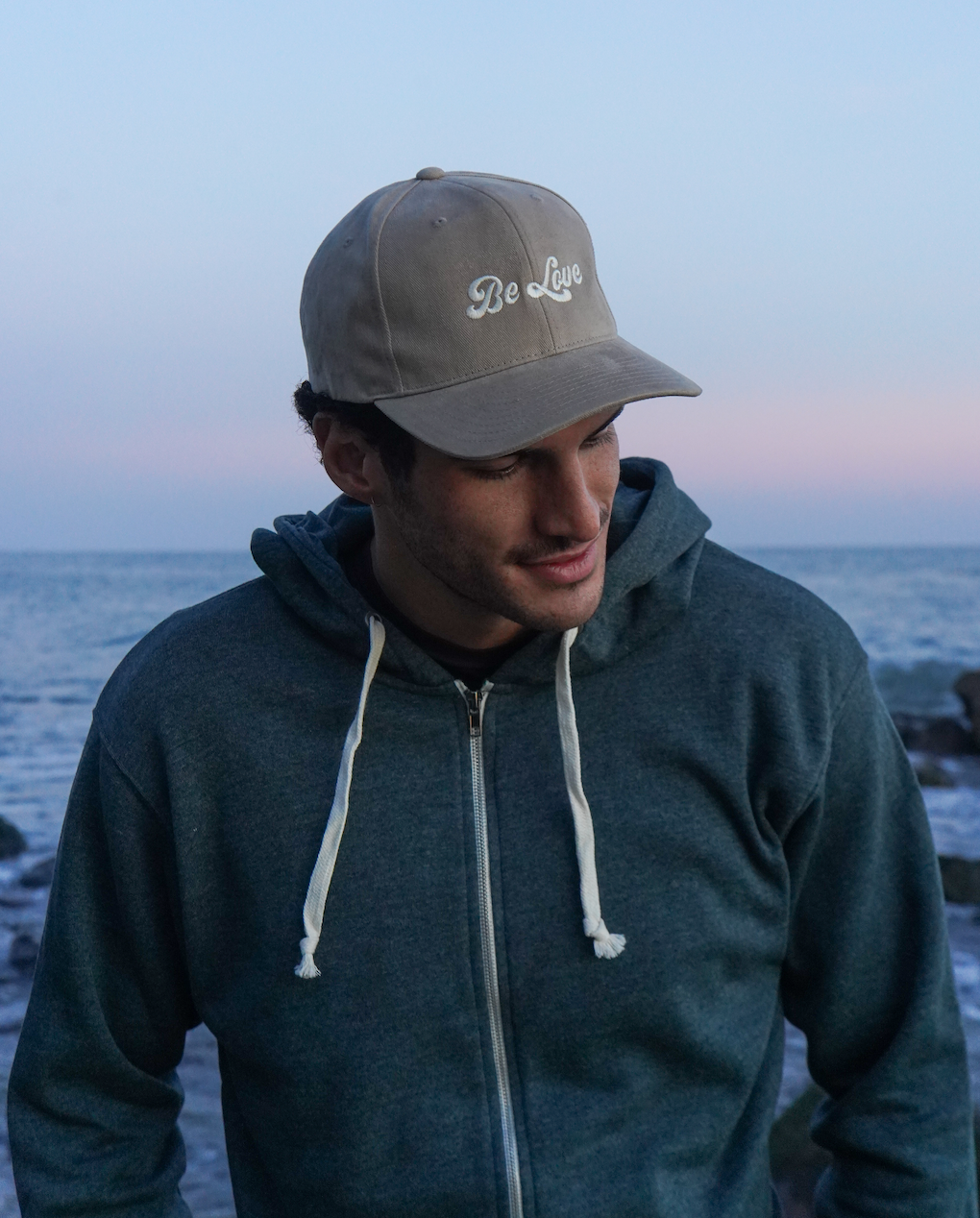Be Love Seventies Font Classic Mid Profile Cap - Sand Dune with white embroidery. Soft brushed cotton twill.