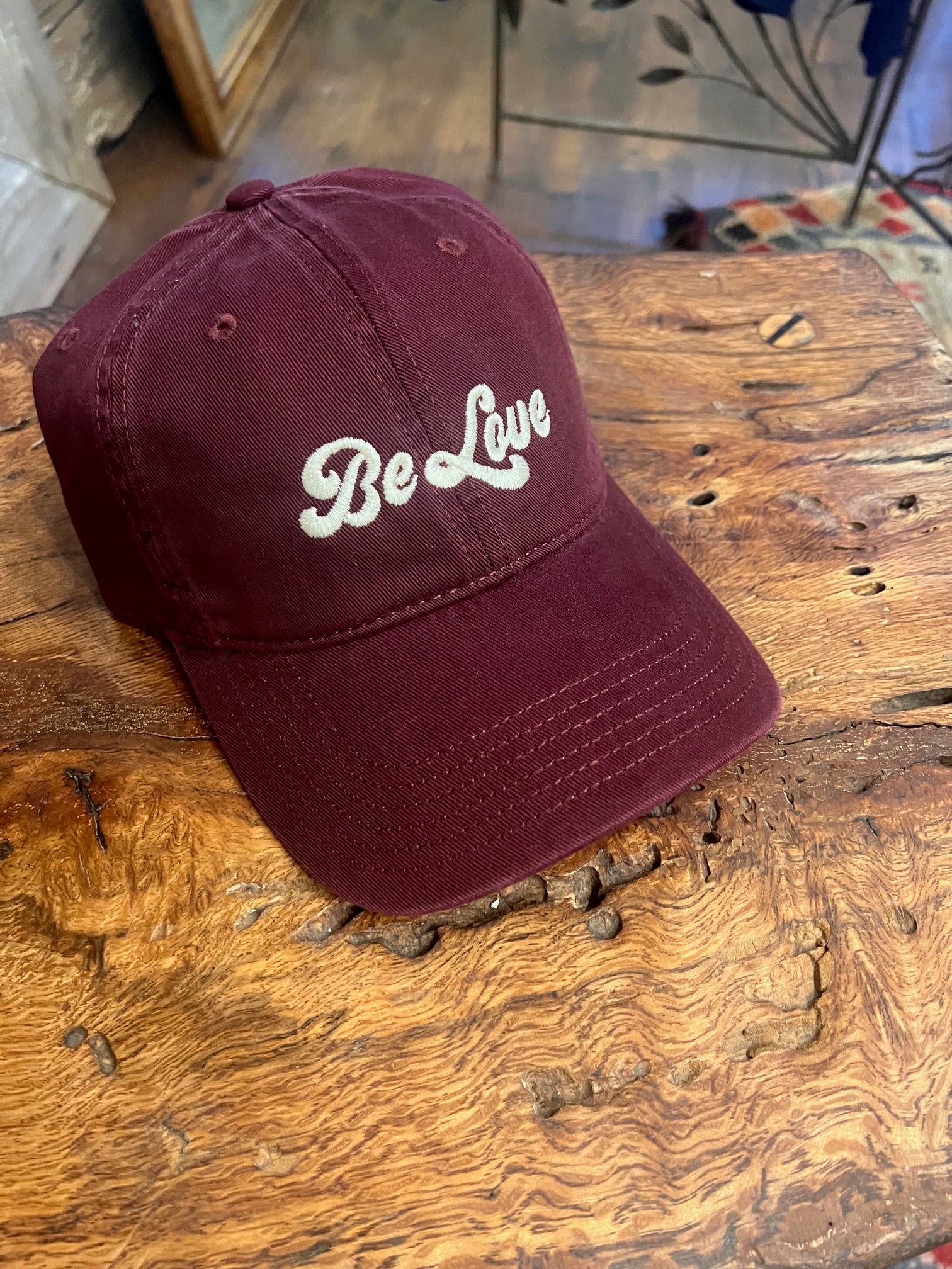 Be Love Seventies Font Classic Dad Hat - Burgandy with white embroidery.